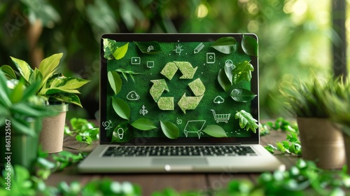 A creative illustration of a laptop made entirely of green, recyclable materials, with a diagram of a circular economy on its screen, showcasing the concept of sustainable practices in technology.