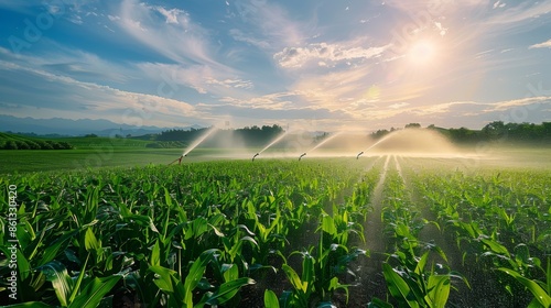 A field of corn is irrigated by a sprinkler system under a bright, blue sky. The sun shines brightly in the background.