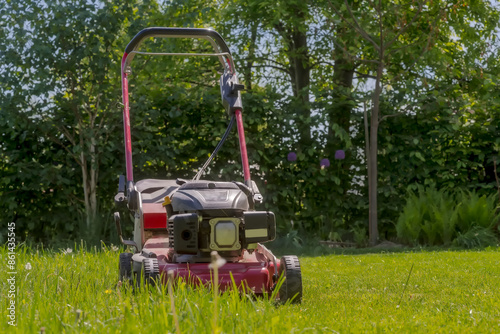 Kosiarka spalinowa z napędzanymi kołami jednej osi - koszenie trawnika. Koszenie trawy na dość rozległym przydomowym trawniku w wiosenny poranek.