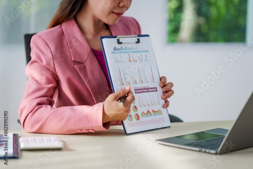 40-year-old middle-aged Asian businesswoman wearing pink suit, business finance, investment strategies, risk management. Skilled in planning, analysis, operations control for business success.