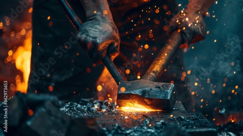 Close-up working powerful hands of male blacksmith forge an iron product in a blacksmith.