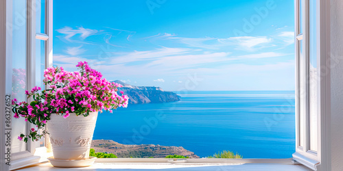 A vibrant pot of pink flowers sits on a white windowsill, framing a breathtaking view of the Santorini coastline and the Aegean Sea under a clear blue sky. The open window invites a refreshing breeze