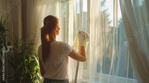 Professional spring cleaning service - Woman uses spray cleaner and mop to restore order and cleanliness to house interior, washing windows and curtains manually.