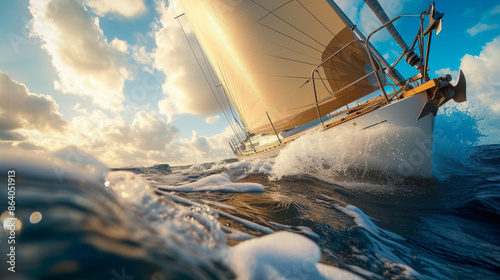 Sailboat in the sea in the evening sunlight, luxury summer adventure, active vacation in Mediterranean sea.