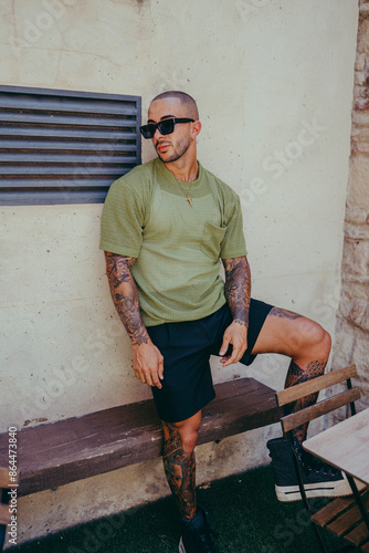 Chico con ropa urbana y traje de baño en hotel muy bonito de vacaciones