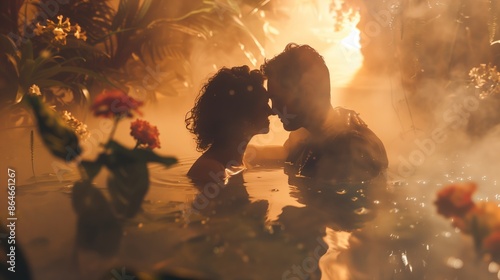A couple enjoys the misty forest, savoring its refreshing aroma and the gentle rustling of leaves.
