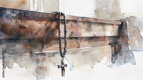 Biblical Illustration of Rosary Hanging on Church Pew on Beige Background, Christian Devotion and Prayer, Copyspace