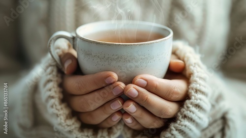 Cozy scene with hands holding a steaming cup of tea, wrapped in a warm sweater, evoking warmth and comfort.