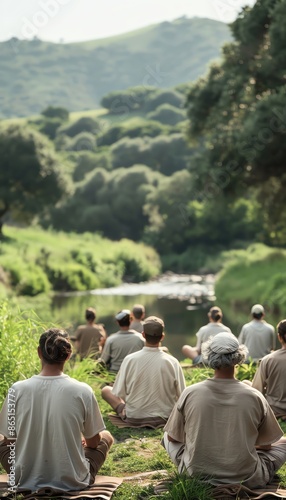 Group meditating outdoors beside a river in a peaceful, lush forest setting with distant hills under a clear sky.