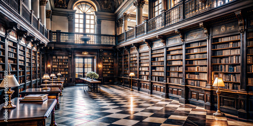 Grand classical library with wooden bookshelves and ornate decor