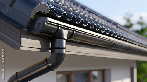 Nowa czarna rynna zainstalowana na dachu pokrytym dachówką z czystą elewacją domu