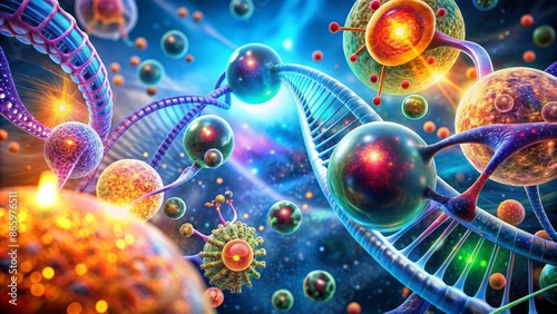Colorful 3D illustration of embryonic stem cells, dna helix, and futuristic medical equipment, representing cutting-edge cellular therapy and regenerative medicine.