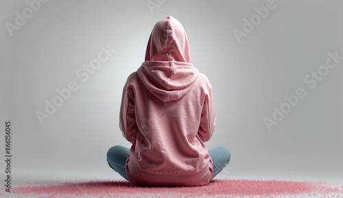 Person in pink hoodie sitting among pink powder particles