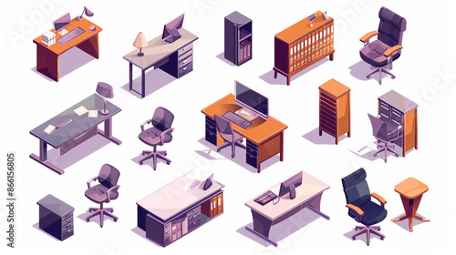 Zbiór izometrycznych ikon mebli biurowych, obejmujący biurka i krzesła. Każda ikona jest precyzyjnie zaprojektowana, aby odzwierciedlać nowoczesny styl i funkcjonalność