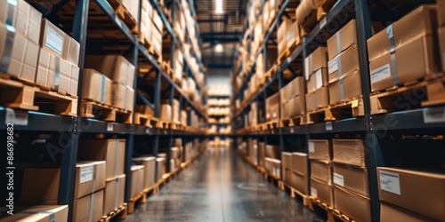 A warehouse with many boxes stacked on shelves. The boxes are mostly brown and white