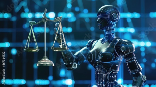 Robot holding scales of justice, representing AI and law.
