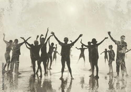 Celebration at the Beach: A Group Cheers and Dances in a Jubilant Mood