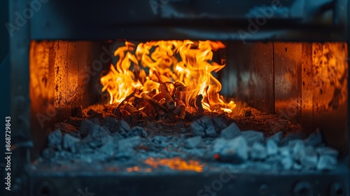 A low-angle photo captures the intense flames burning inside a crematorium furnace, emphasizing the heat and solemn atmosphere