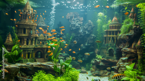 A vibrant aquarium with castle-themed decorations, lush green plants, and colorful fish swimming around, creating a lively underwater scene.