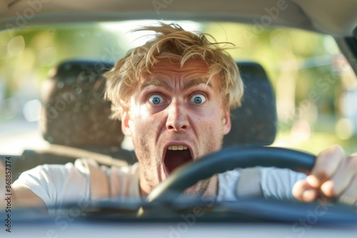 A blond man with his mouth wide open is driving a car and looks very scared. AI.