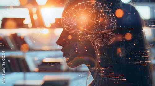 A close up of a person s head, focusing on the brain area with superimposed graphics of neural