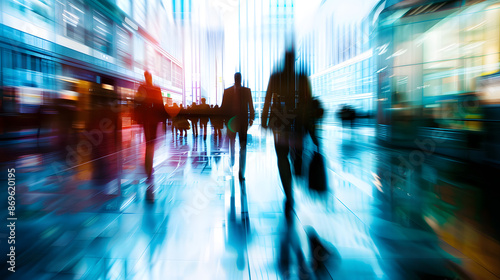 Abstract long exposure motion crowd of business people walking commercial centre corporate office in modern city downtown street. Fast pace busy crowded stress professional finance businessman