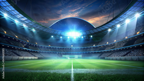 A stunningly illuminated soccer stadium at dusk, ready to host an epic match on a perfectly manicured field.