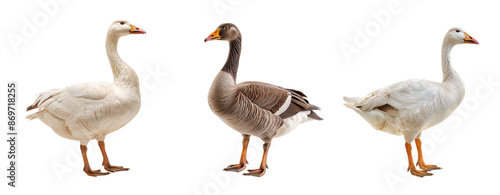 Three geese isolated on transparent background, bird poultry brown domestic