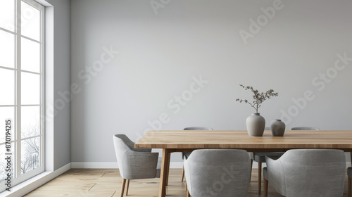 Minimalist living room interiors composition with a dinning table next to a window, no people and minimal furniture. Luxury Real Estate composition.