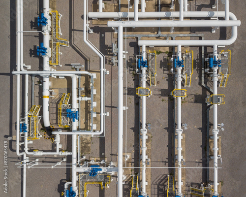 Aerial view natural gas pipeline, High pressure pipes gas plant pipelines, Industry natural gas pipeline with high pressure compressor station energy transportation infrastructure, Gas plant station.