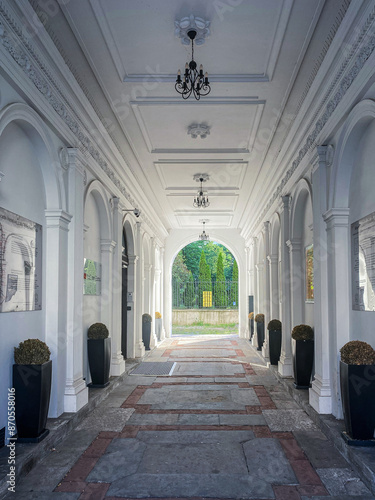 Stylowe, eleganckie, odrestaurowane, wnętrze bramy w miejskiej kamienicy. Kamienica Wokulskiego. Ścieżka literacka "Lalka". Stara, historyczna Warszawa. Krakowskie Przedmieście.