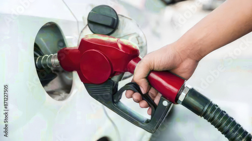 Person hand holding gas pump nozzles to pump petrol oil gas into the tank of vehicle car at gas station. Concept of oil prices, inflation, transportation