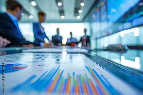 A close-up photograph of a conference table with financial charts spread out. Business executives are out of focus in the background, reviewing the charts and discussing business strategy