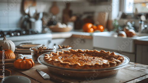 Thanksgiving kitchen with freshly baked pumpkin pie
