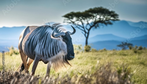 gnu in the grasslands of the game reserve in Southern Africa , generated by AI. High quality photo