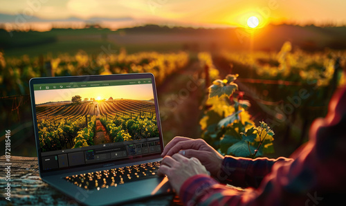 Modern agriculture technology with a person using a laptop to analyze data on sustainable farming practices at sunset in a vineyard