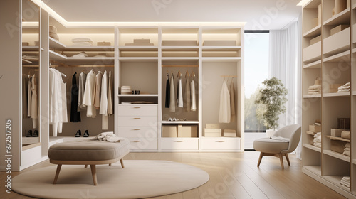 Beige and large wardrobe closet in dressing room, Luxury modern style.