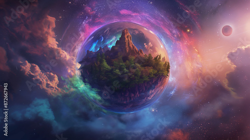 Sphere elementaire sandy earth, splash art league of legends style, inside there is an island with forest and mountains, colorful nebula around the sphere