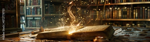 Ancient magical book in old library with golden light sparkles, symbolizing knowledge, mystery, and enchantment.
