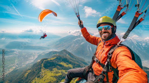Paragliding man takes a selfie during flight - Extreme sport concept - Models by AI generative
