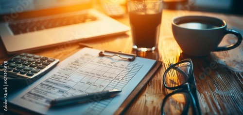 Closeup of mortgage payment calculations on a notepad with a calculator and coffee, personal finance routine