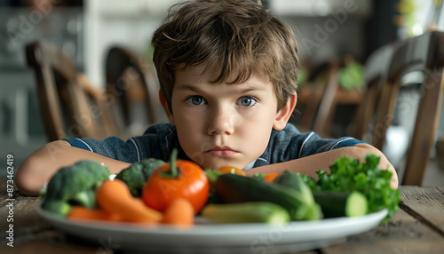 A displeased young boy staring at a plate of healthy vegetables, showing reluctance to eat his greens