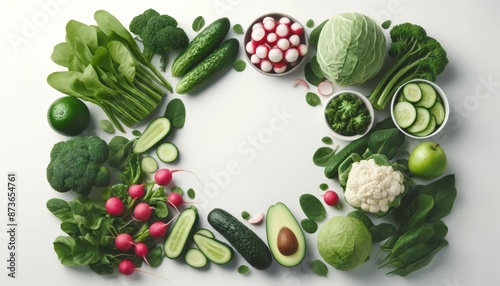 Fresh green vegetables and healthy ingredients arranged in a circle on a white background, showcasing a variety of nutritious food options.