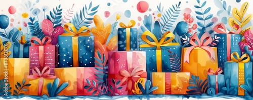 山のように並べられた誕生日プレゼントのカラフルなイラスト