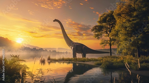 Brachiosaurus dinosaur at lakeside during sunset. Concept of prehistoric life, extinct animals, nature landscape