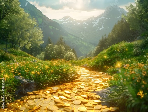A river of golden coins flowing through a lush green valley symbolizing abundant financial resources and growth