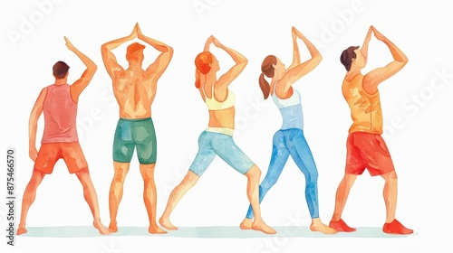 A lively watercolor rendering of stretching exercises, showing individuals improving their flexibility and mobility, isolate on white background with copy space