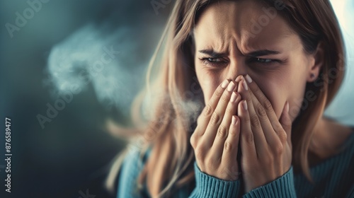 Woman covers her nose with her hands from the acrid tobacco smoke around, the problem of dangerous for health, second-hand smoke