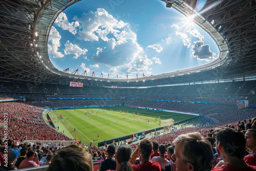 A group of people are sitting in a stadium, wearing red hats and jackets