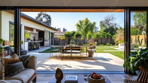 view of a suburban mid-century modern home with a seamless flow between the interior spaces and the outdoor patio, perfect for entertaining